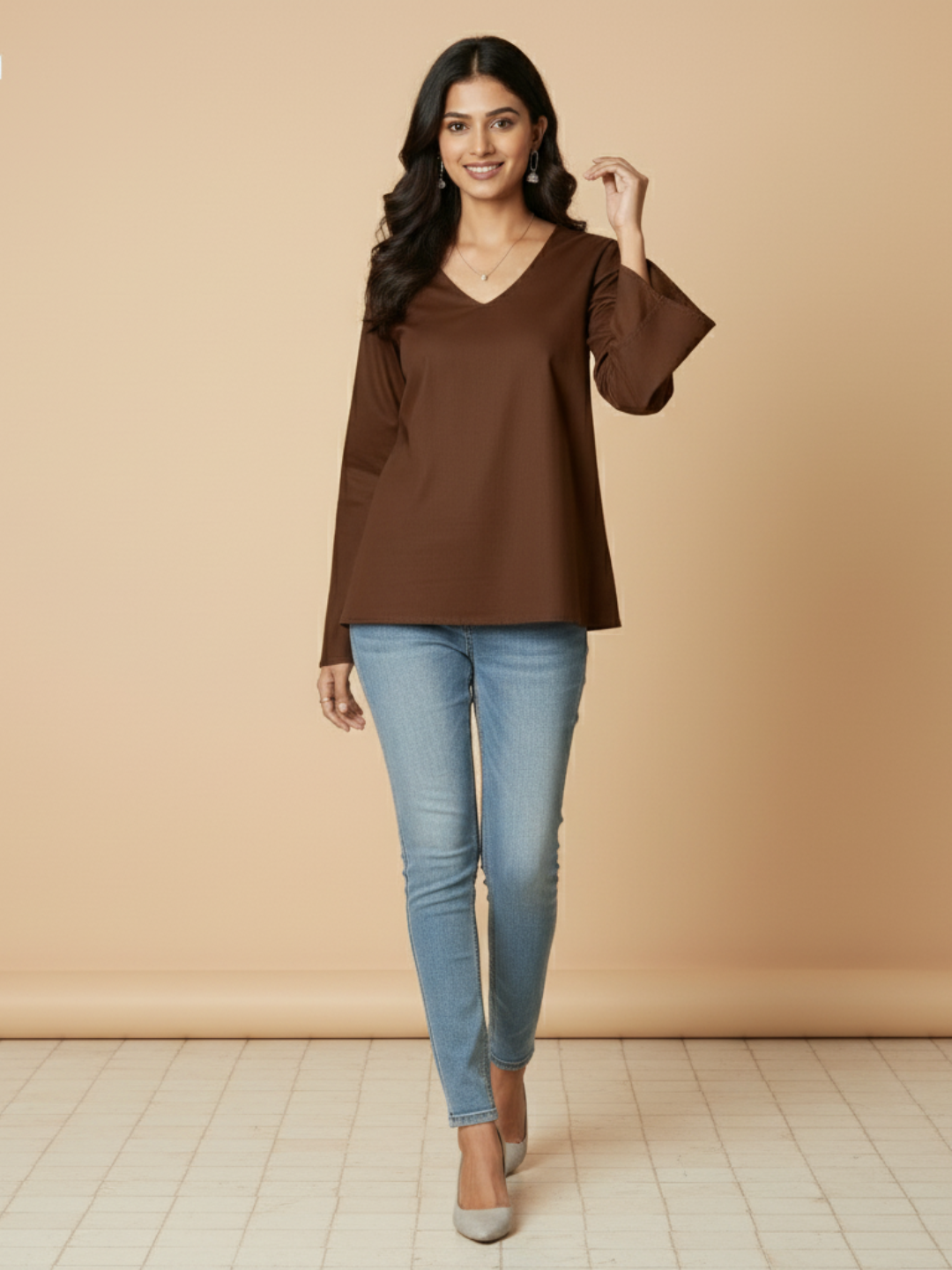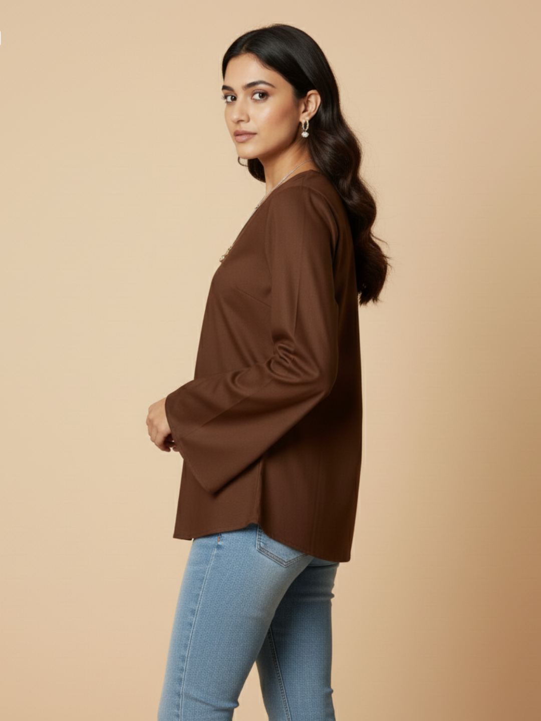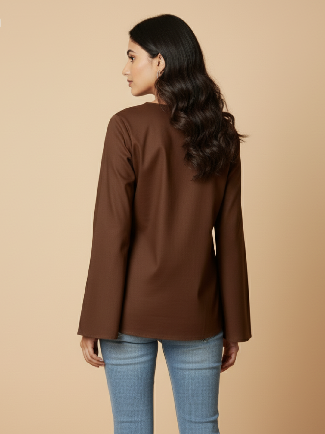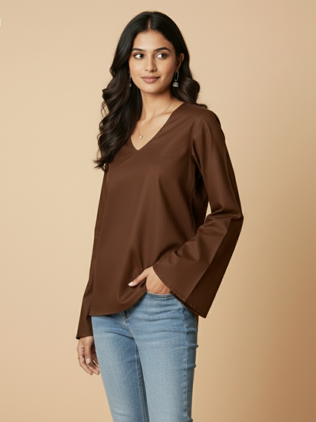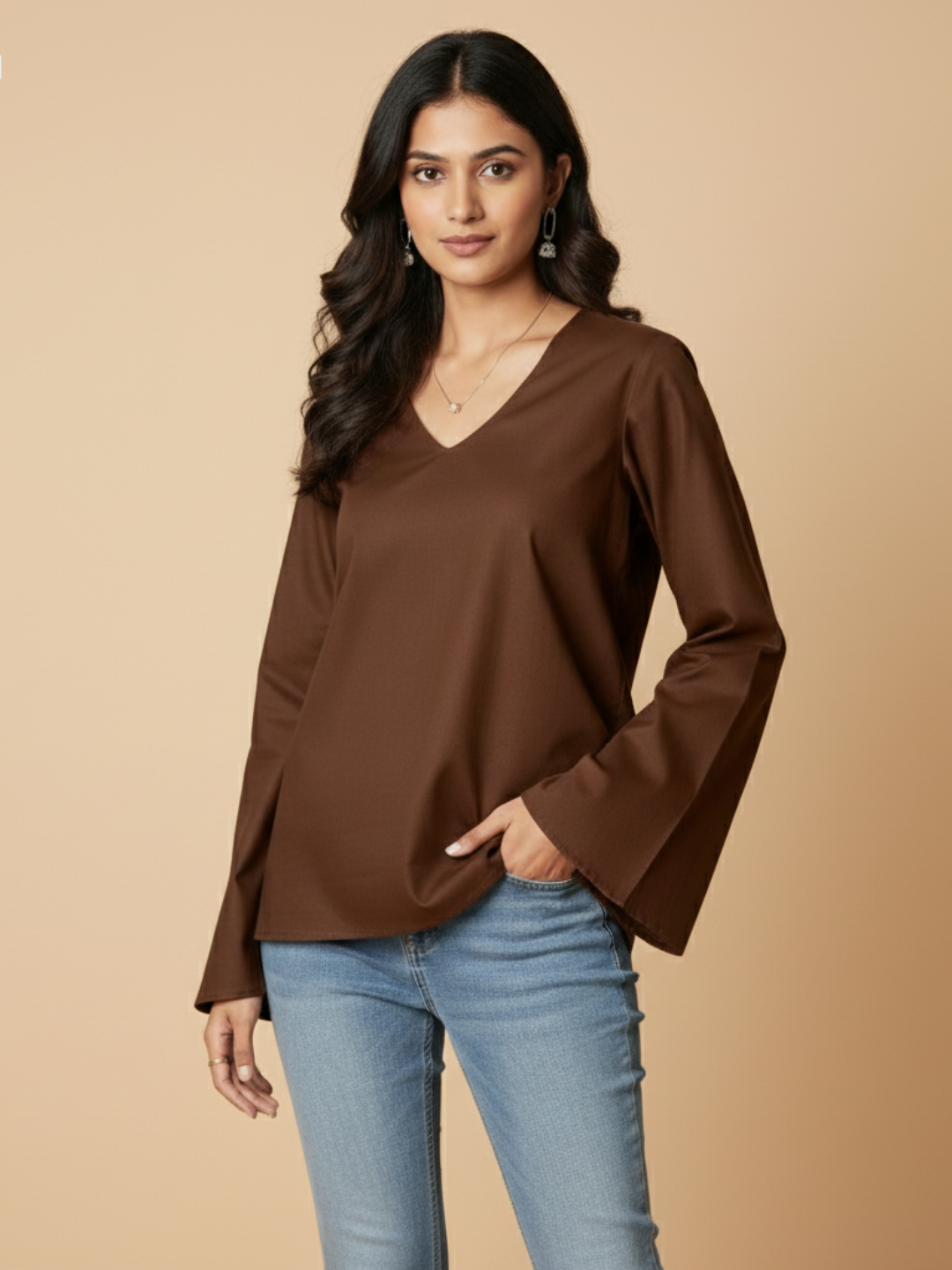 Meet Anya - Your new favorite brown top. This chic bell sleeve tunic features a relaxed V-neck and dramatic flared sleeves for a comfy-chic vibe. Crafted from a lightweight, flowy fabric, it's the perfect coffee brown top for office looks or casual days. A must-have.