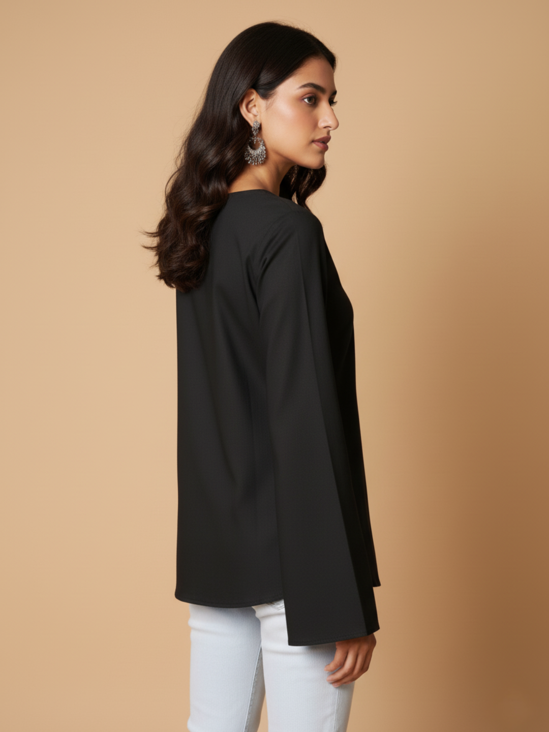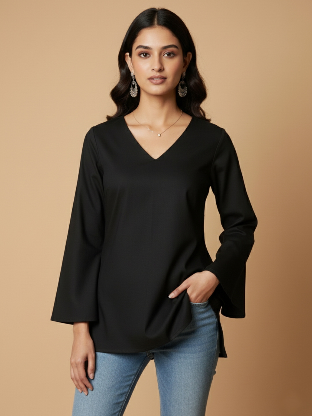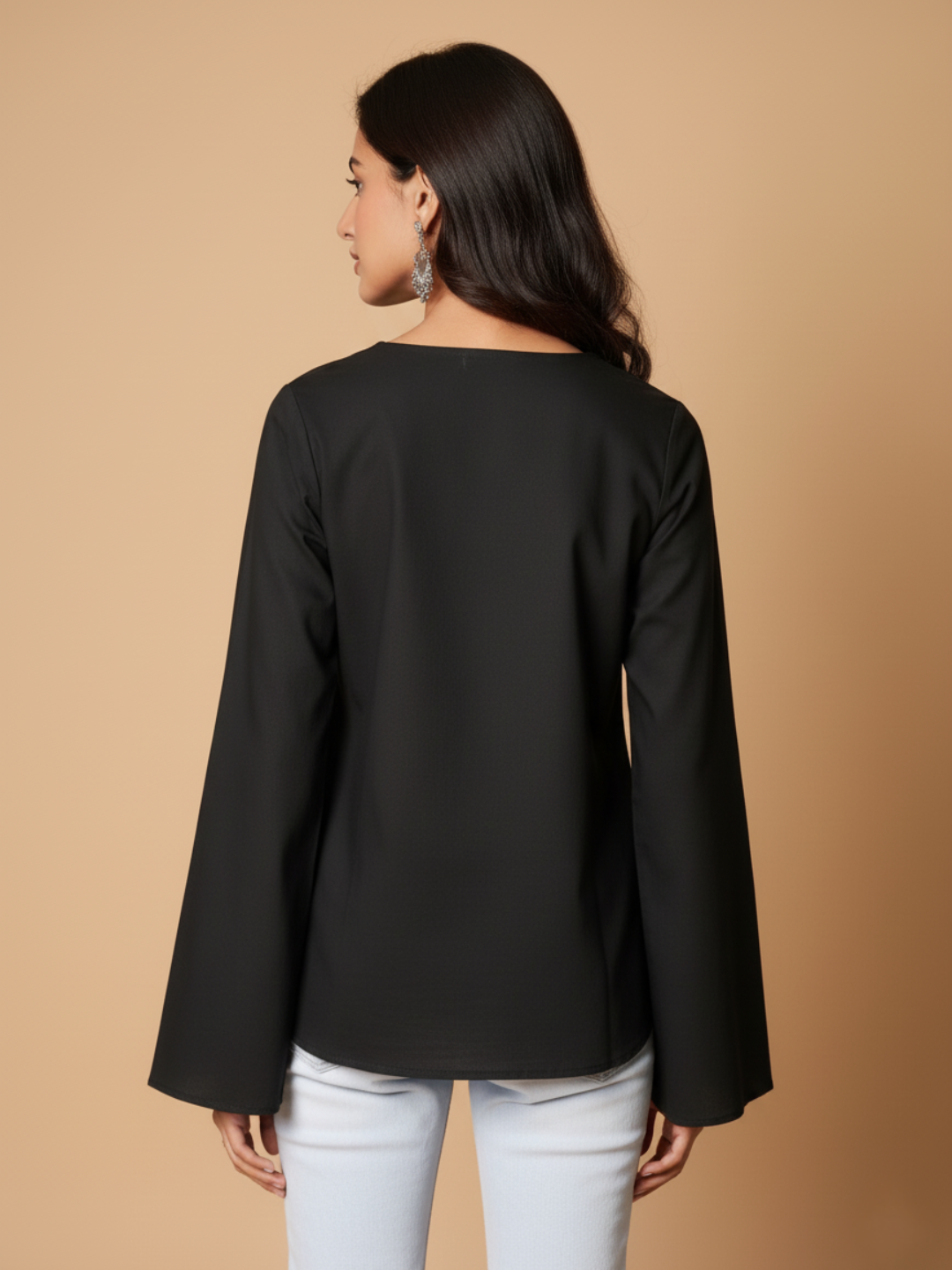 Shop the black bell sleeve top for Yourself—lightweight, breathable, and effortlessly stylish. Features a chic V-neck, relaxed fit, and dramatic bell sleeves. Perfect for office, casual outings, or evening looks. Elevate your wardrobe today!.